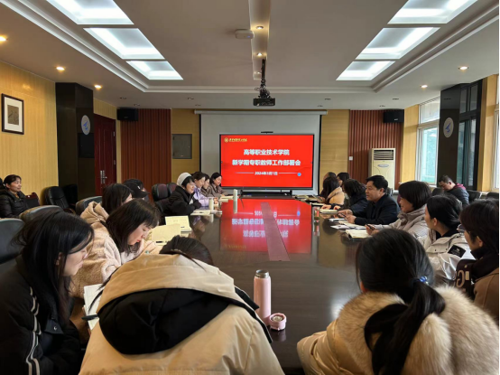 2024年3月1日上午11:00,高等职业技术学院在明理楼216会议室召开了新学期专职教师工作部署会。学院院长舒忠、办公室主任陆鹤、教务员及全体教师参加此次会议,会议由副院长于莉主持。