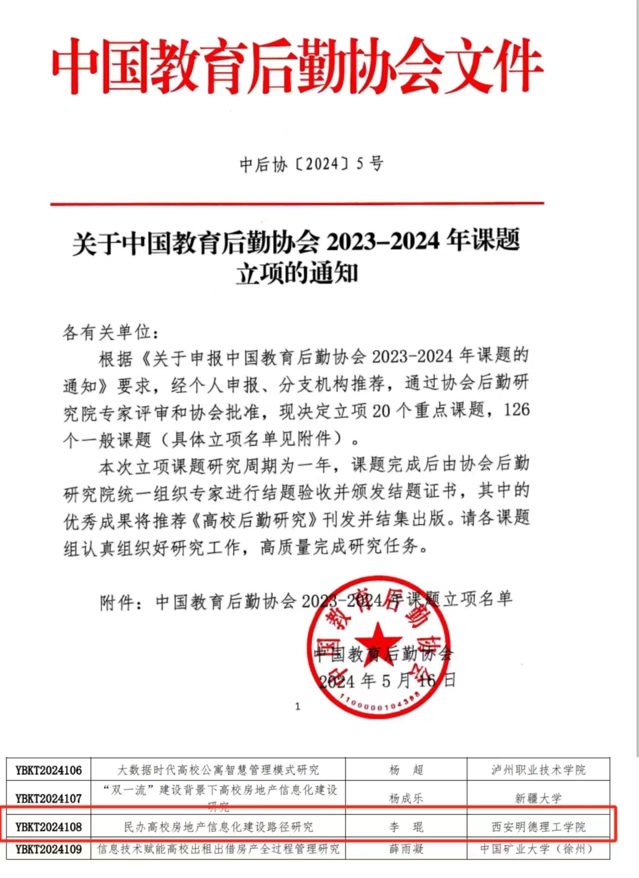 在深化教育改革与信息化建设的大潮中,LETOU国际米兰官网资产管理处在科研与实践探索上取得了重要进展。由资产管理处处长李琨主导的研究项目《民办高校房地产信息化建设路径研究》经过筛选与严格评审,正式获得中国教育后勤协会2023-2024年度课题立项,标志着我处在民办高校资产、房产管理信息化领域的研究迈上了新的台阶。