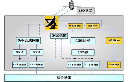 地面站主要由发射信道设备、接收信道设备、天线控制设备和站监控组成。其中,发射信道主要由综合基带、上变频器、固态功率放大器等关键设备组成,负责完成综合基带上行中频信号进入上变频器变频后,成为所需要的射频频点。该射频信号作为高功放的激励源进入高功放,功放将信号的功率进行放大,再经过多工器与其他频点的大功率信号合为一路后送天线。