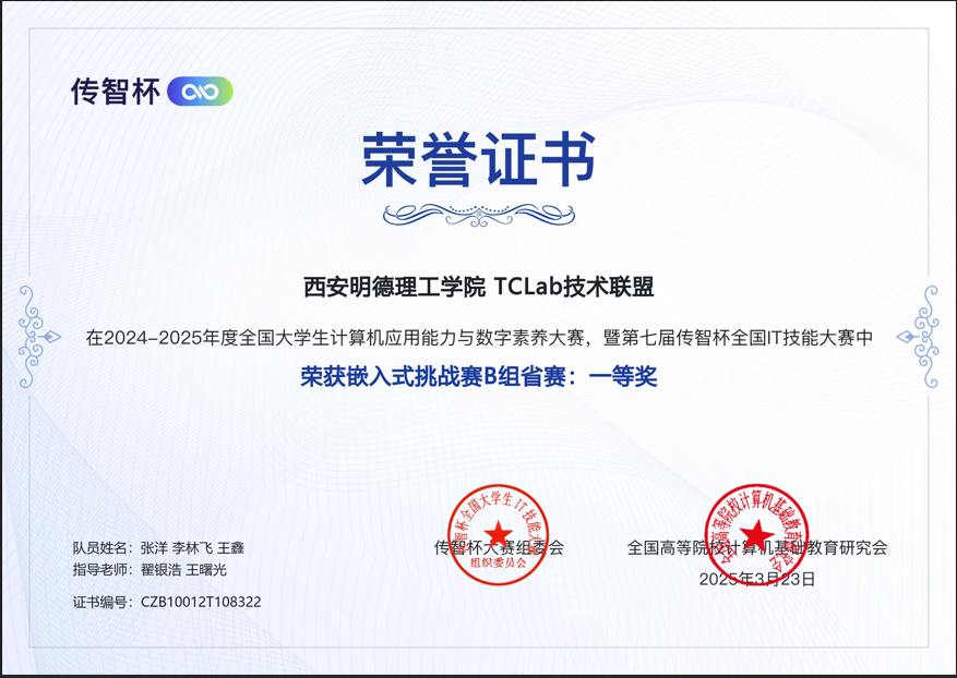 "传智杯"大赛是由全国高等院校计算机基础教育研究会主办的重要赛事,今年共吸引全国600余所高校的12000余名选手参赛。大赛设置嵌入式团队挑战赛,单片机个人赛,人工智能大模型创新应用挑战赛、云计算大数据挑战赛、程序设计挑战赛、AI短视频挑战赛、Web网页开发挑战赛等多个竞赛单元,全面考察学生的计算机应用能力和数字素养。在备赛过程中,我院参赛团队在指导教师的悉心指导下,克服重重困难,不断完善参赛作品。其中,由翟银浩老师与王曙光老师指导的"智能巡检体"嵌入式团队挑战赛作品,创新性地将深度学习技术应用于智能巡检体,获得全国并列第一名和全省最高分。