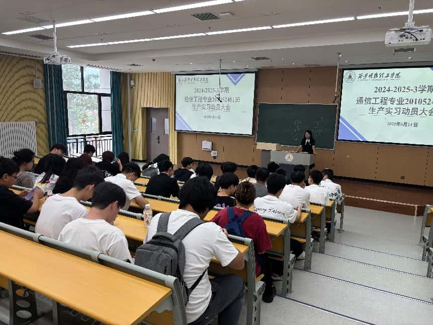 为深化产教融合,提升学生实践能力,推动应用型人才培养高质量发展,信息工程学院通信工程专业于2025年6月24日,分别了进行了教师动员大会,2022级、2023级和2024级学生动员大会。专业负责人、实习带队老师、辅导员及全体通信工程专业学生参加会议。本次实习共涉西安鸥鹏互联科技有限公司、西安安泰电子科技有限公司、西安航光卫星测控技术有限公司及西安协力超越科技有限公司四家公司,涉及学生318人。
