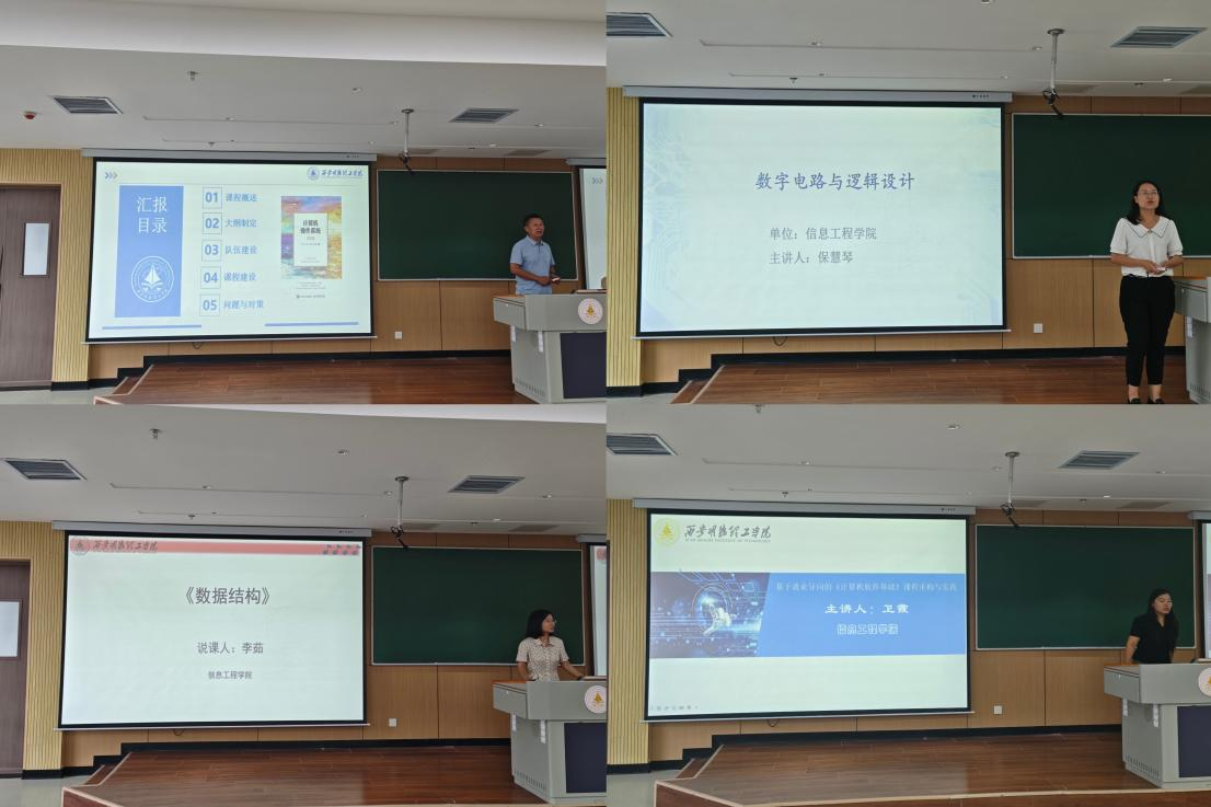 在教学评建“说课程”“说教学”示范环节,以“现场汇报+课件展示+教学片段演示”的形式,邀请教学经验丰富的老教师进行了现场范例。课程负责人陈世亮老师以《操作系统》课程为例,从 “课程概述、大纲制定、队伍建设、课程建设、问题与对策”五个维度展开阐述,将课程目标达成度与学生创新能力培养紧密结合,赢得阵阵掌声。保慧琴老师以《数字电路与逻辑设计》课程为例,从课程总体分析、课程目标、课程重难点、教学方法等方面生动诠释了“以学生为中心” 的教学设计理念,为工科类课程教学提供了可借鉴的模板。李茹老师以《数据结构》为例,从课程概述、课程大纲制定、课程团队建设、课程资源建设、存在问题及对策、课程建设、课程特色创新举措、教学成效等八个方面进行“说教学”现场展示。卫霞老师以“基于就业导向的《计算机软件基础》课程重构与实践“为主题的“说教学”现场展示,从”课程内容、学情分析、创新过程、成效评价、持续改进”等五个方面阐述了“教学不是单向灌输,而是师生共同创造知识的过程”的思想。