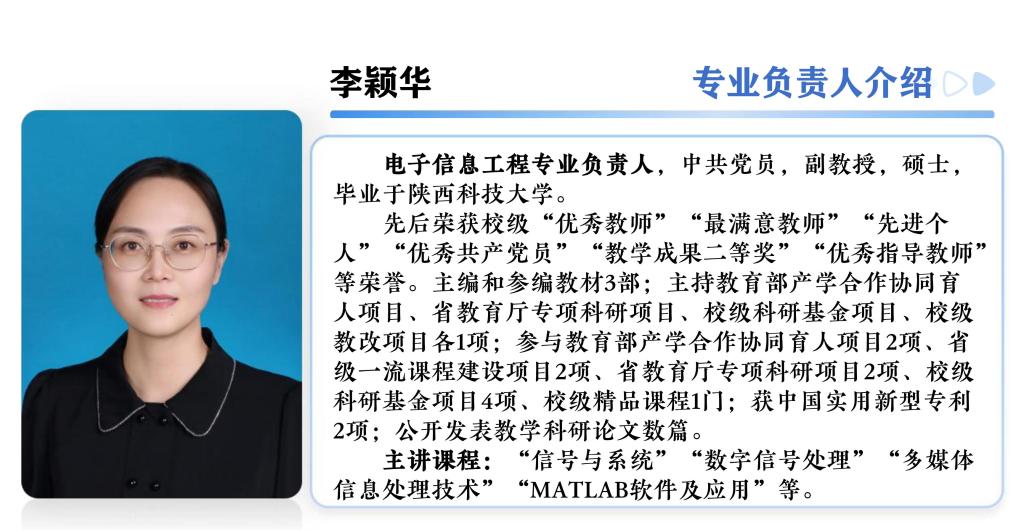 电子信息工程专业拥有一支高素质、专业化的教师队伍,他们不仅具备卓越的学术背景,还拥有丰富的企业实践经验。教师团队普遍具有硕士以上学历。其中,教授1人,副教授2人,讲师1人,工程师2人,助教5人。此外,双师型教师4人,既具备扎实的理论基础,又拥有丰富的实践经验。同时,还拥有省级“课程思政教学能手”1人,以及多位校级优秀教师、最满意教师,在教学和科研方面均取得了显著成绩。在科研和教学成果方面,教师团队主持及参与了省级以上的科研、教改项目十余项,发表了50多篇学术论文。